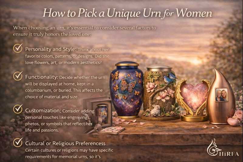 At Hirfa, we understand the importance of memorializing women with dignity and care, offering thoughtfully curated collections that reflect beauty, elegance, and personal expression. By choosing a unique urn, families in the USA, UK, and Australia can create a lasting tribute that truly honors her life.